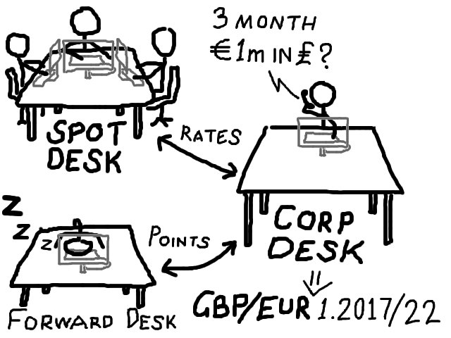 Within a bank an FX trading team is made up of a series of desks with traders on each desk responsible for making specific types of trades that hedge or speculate against different types of risk. There is the spot desk that usually has 4 or more traders, the forward desk with 1 or more, there may be a closely related money market desk and, most pertinent to this example, there is a corporate desk that provides a more polished customer facing role. The sum total of all of the trades done between all financial institutions should, in theory, be zero – it's the trades banks do with outside companies where their risk-free profits come from. In this case the UK based business contacts the corporate desk of the bank and states that they're interested in the GBP value of €1m in three months. The corporate desk will confer with his colleagues on the spot and forward desks and come up with a bid/offer spread, namely, GBP/EUR 1.2017/22. This means that they will agree today, to deal in three months either buying £832,154.45 (11.2017 x 1m) or selling £831,808.35 (11.2022 x 1m) for €1m. The business agrees to "lift the offer" for £831,808.35 knowing that whatever happens to Euro exchanges rates, that figure will be guaranteed.