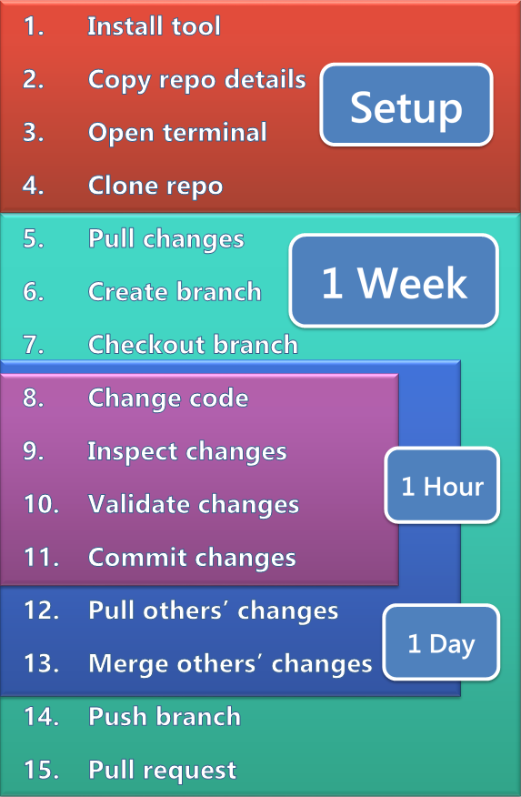 Now that we're familiar with some of the features of git, let's return to the three loops that exist in this workflow. They each have an upper bounded time limit that you should aim to stick to. Frequently going over these time windows suggests working practices that aren't conducive to good software development.