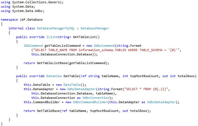 Developers who wish to tailor D-Lighted to connect to different databases are in luck. By using the Abstract Factory pattern, all that needs to be implemented are three functions in two classes (and adding a button to the main XAML window).