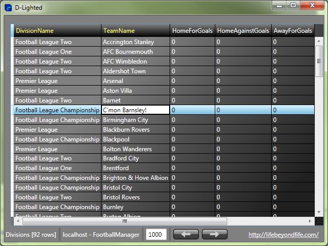 D-Lighted is a free, open-source Windows database tool that allows users to connect to multiple different database platforms all from within the same small executable. The simple, uncluttered user interface is perfect for DBAs or developers who need to get into a database quickly, open up a table and check the data, add or delete a row, or edit some values. D-Lighted currently supports connections to Microsoft SQL, MySQL (thanks to MySQL's .Net Connector), SQLite (thanks to System.Data.SQLite), Oracle and PostgreSQL (thanks to pgFoundary's .Net Data Adapter for PostgreSQL) but visitors to this blog are free to request more in the comments section below. The installers and sourcecode can be found in the downloads section.