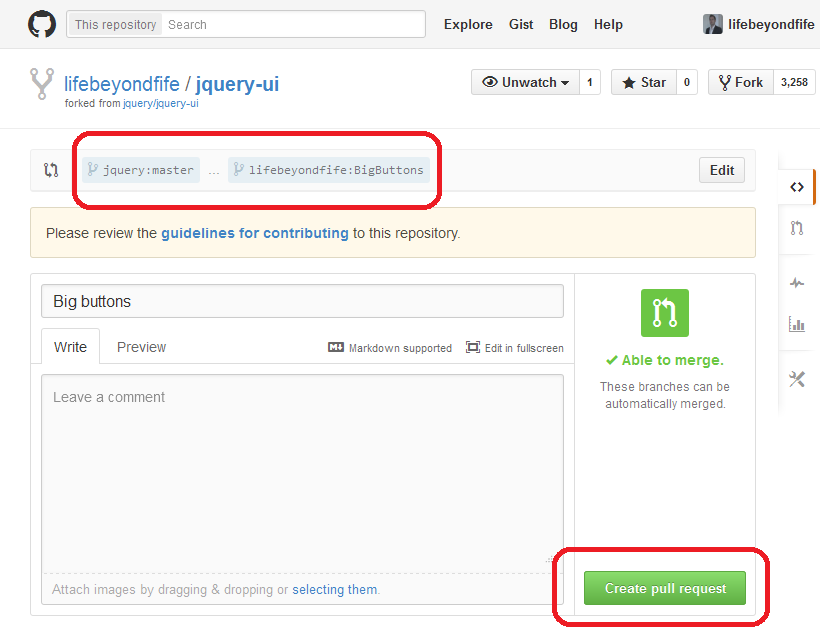 NB – because we don't have admin rights to the jQuery-UI project, we push the changes not to where we originally cloned the repo from, but rather to our personal fork. If you were pushing a change back to the same server as where you initially cloned the repo, swap -u https://github.com/lifebeyondfife/jquery-ui for origin.