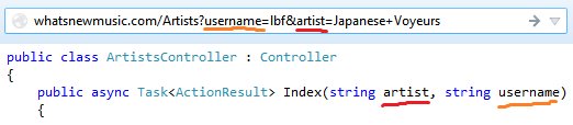 I'll not go into too much detail about how MVC works in general but I will briefly describe how this site uses it. Requests from a client browser map to specific code entry points in the Controller with http GET variables passed through as parameters. The specific Controller code communicates with the Model to get the artist or album specific data and uses dynamic functionality now available in .Net to create a property bag. This dynamically typed object is passed to the View where a skeleton HTML file and some final code structures are combined using Razor to produce the HTML, CSS and JavaScript that's sent back to the client's browser.